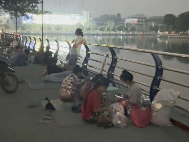 3月29日晚,缅甸曼德勒市,强震发生后,在河边避难过夜的灾民。黎艺夕/摄