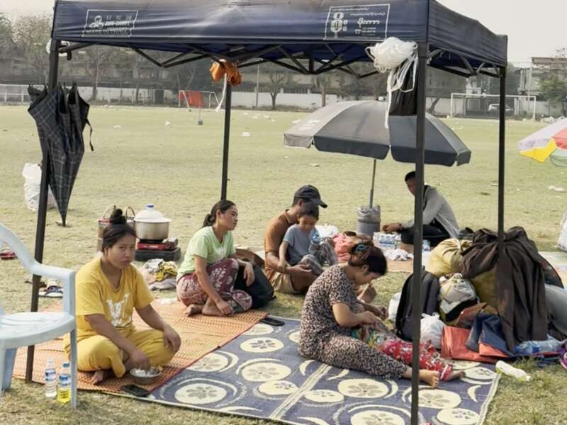 3月30日上午,缅甸曼德勒市,强震发生后,在体育场空地避难生活的灾民。黎艺夕/摄