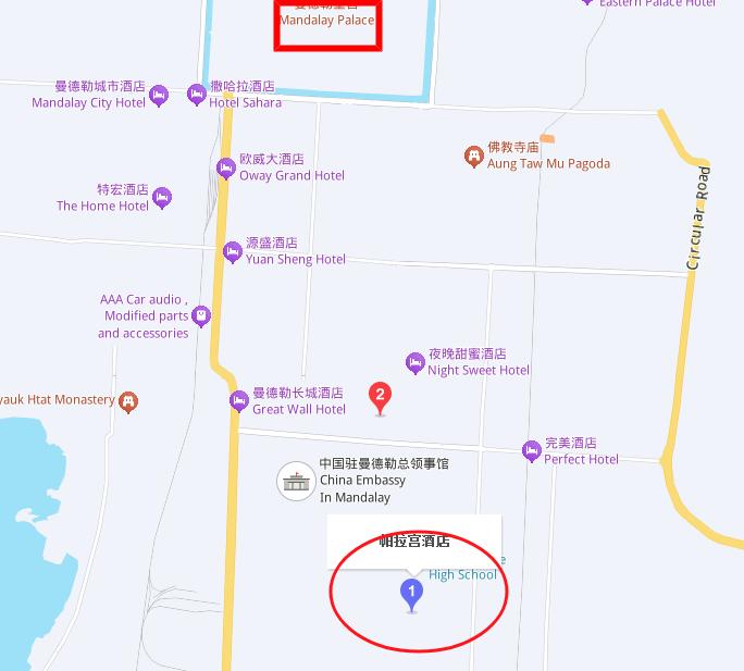 帕拉宫酒店位于曼德勒皇宫南部,距离曼德勒皇宫在10公里以内。据媒体报道,3月28日,缅甸发生7.9级强震后,曼德勒皇宫的宫墙倒塌。该皇宫是缅甸最后一个王朝贡榜王朝的宫殿,宫墙内一座塔楼也坍塌。当地多处楼房出现倒塌倾斜,砖块散落街道,居民逃生后叫喊救人,救援人员正在废墟里寻找被困人员。