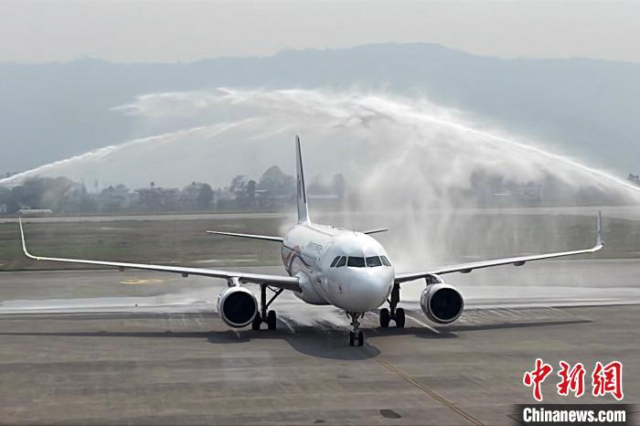 3月31日,喜马拉雅航空H9731航班由拉萨贡嘎国际机场飞抵尼泊尔博克拉国际机场,受到水门礼迎接。 中新社 记者 崔楠 摄