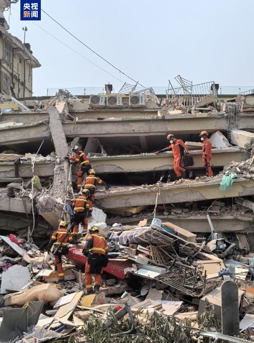 缅甸当地时间4月1日,中国救援队联合中国香港特区救援队深入曼德勒受灾最严重的天空公寓救援点开展联合搜救。