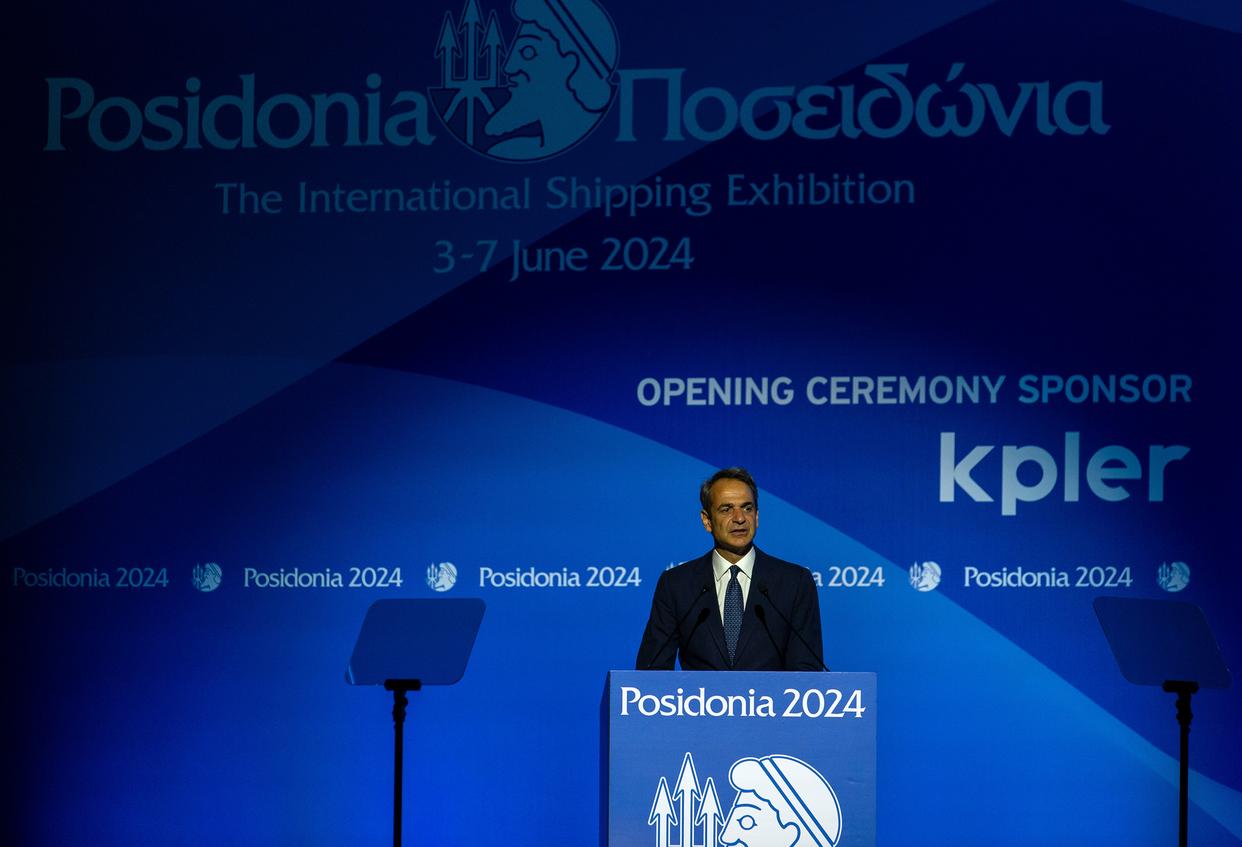 2024年6月3日,希腊总理米佐塔基斯在雅典举办的波塞冬国际海事展开幕式上致辞。新华社发(马里奥斯·罗洛斯摄)