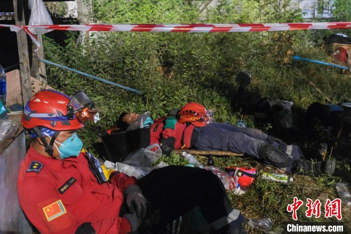 夜色愈加深重,天气闷热依旧,各救援队顾不上吃晚饭,轮番上阵,救援人员无一不浑身湿透。轮换期间,有救援人员和衣而卧,躺在草坪上休息。