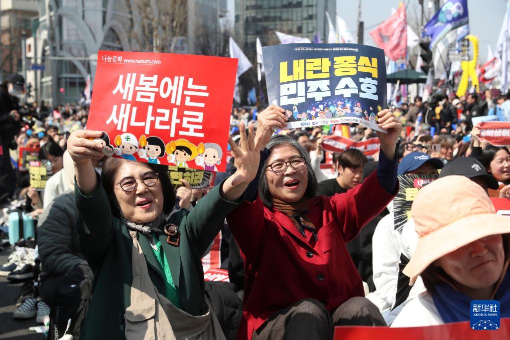 4月4日,民众在韩国首都首尔的韩国宪法法院附近庆祝尹锡悦弹劾案获得通过。新华社记者 姚琪琳 摄