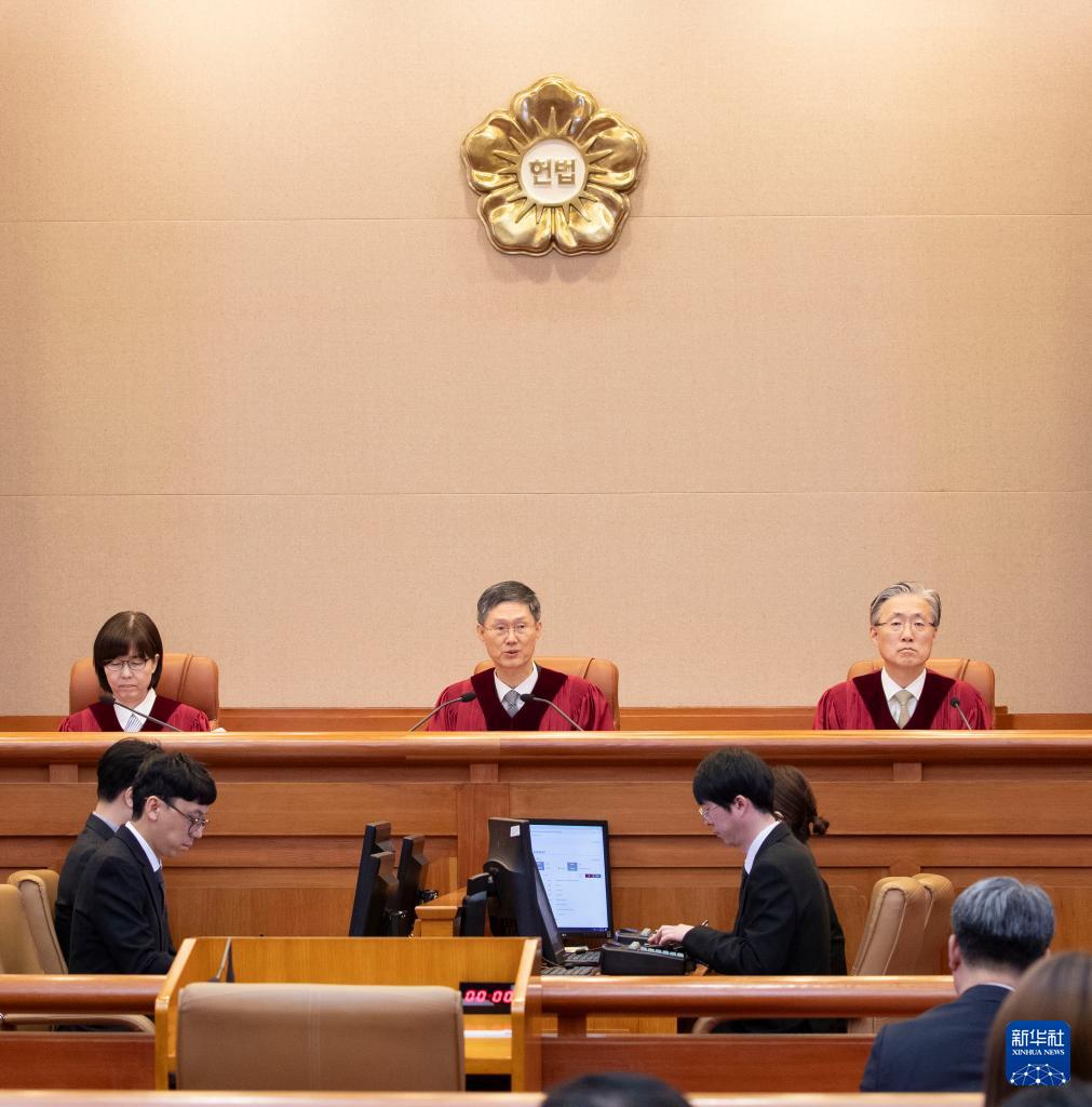 4月4日,在韩国首都首尔,韩国宪法法院代理院长文炯培(中)宣读尹锡悦弹劾案裁决书。新华社发(Pool图片,李相浩摄)