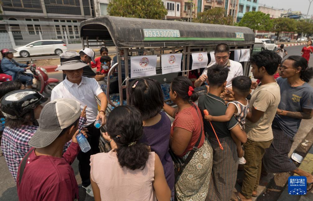 4月4日,在缅甸曼德勒皇宫附近的一处安置点,缅甸曼德勒中国企业商会的工作人员分发饮用水。新华社记者 才扬 摄