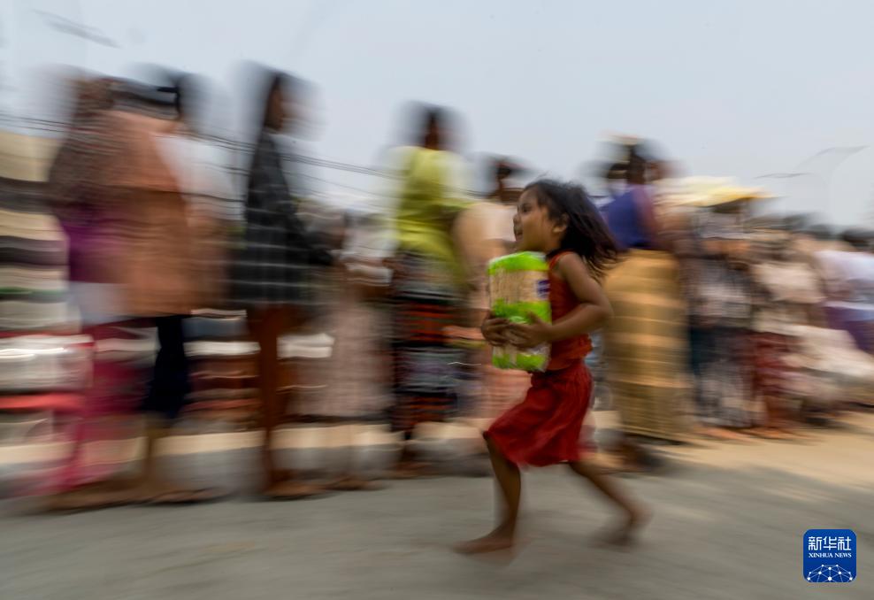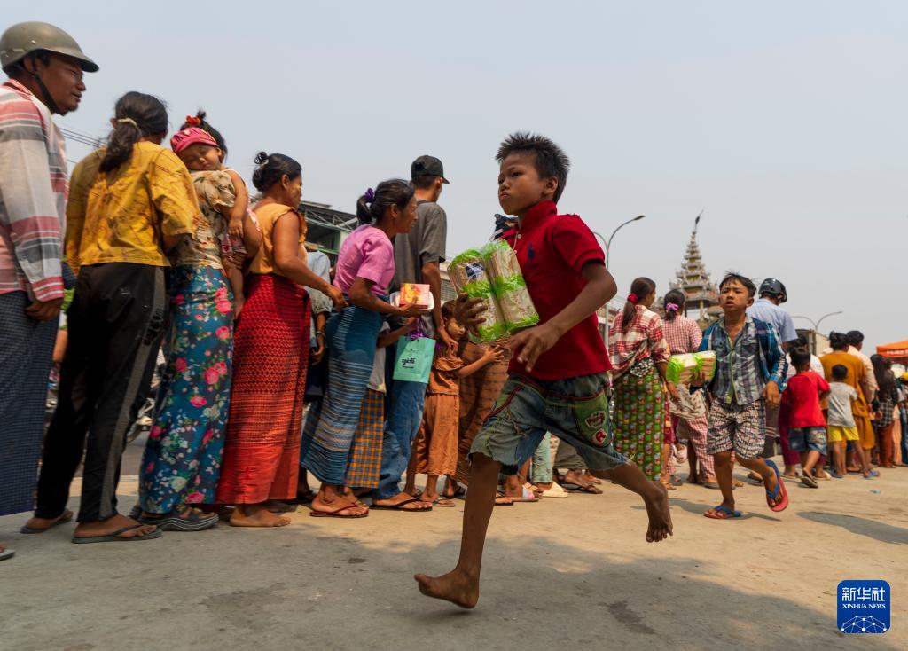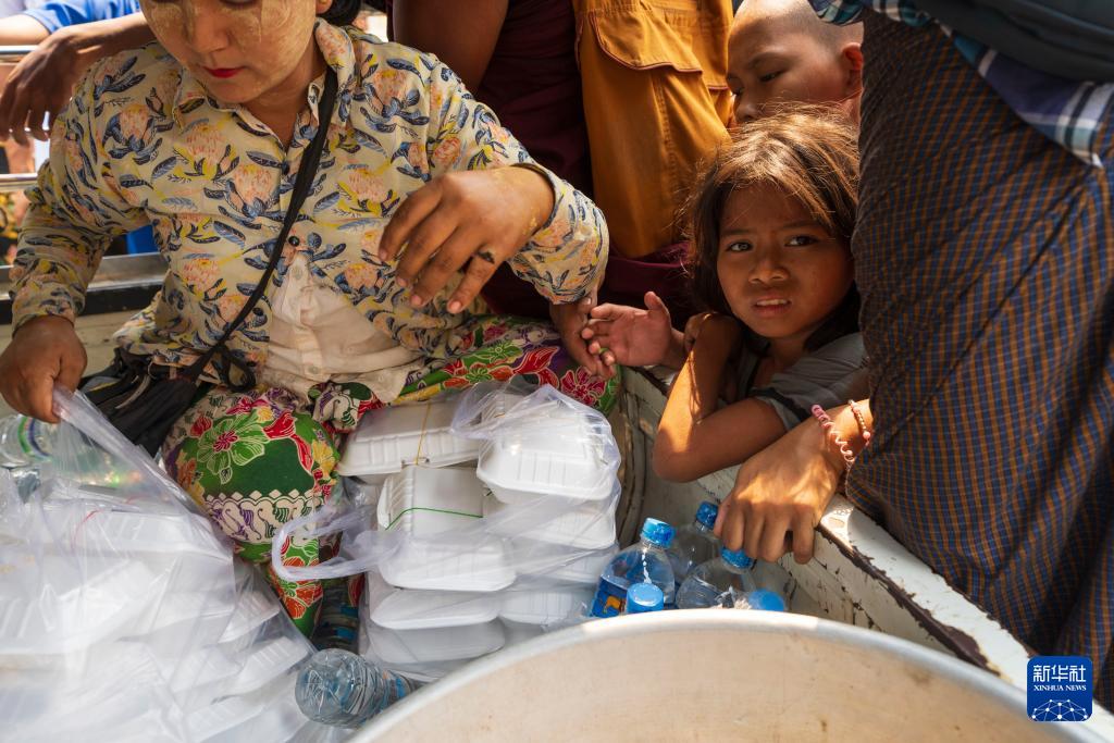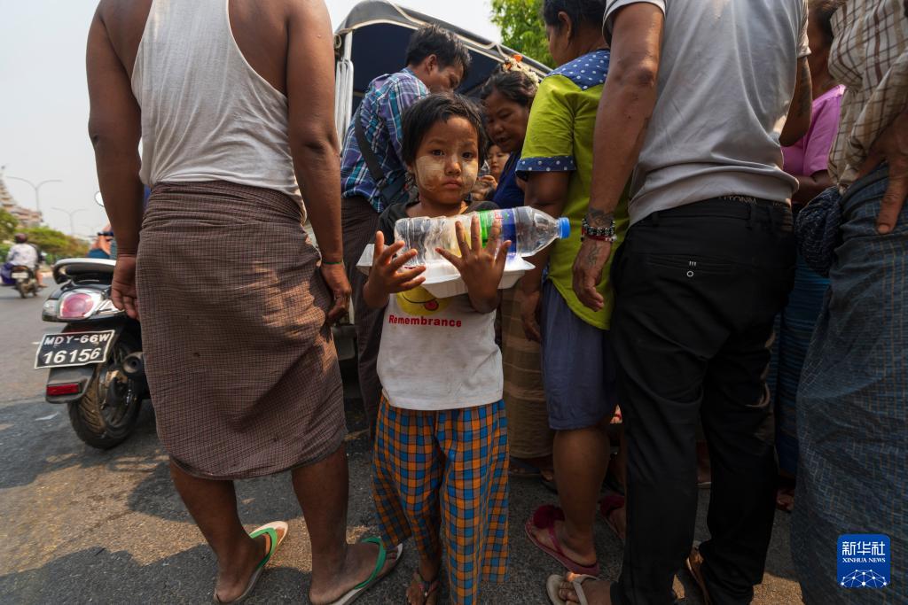 4月4日,在缅甸曼德勒皇宫附近的一处安置点,一名儿童领取食物和饮用水。新华社记者 才扬 摄