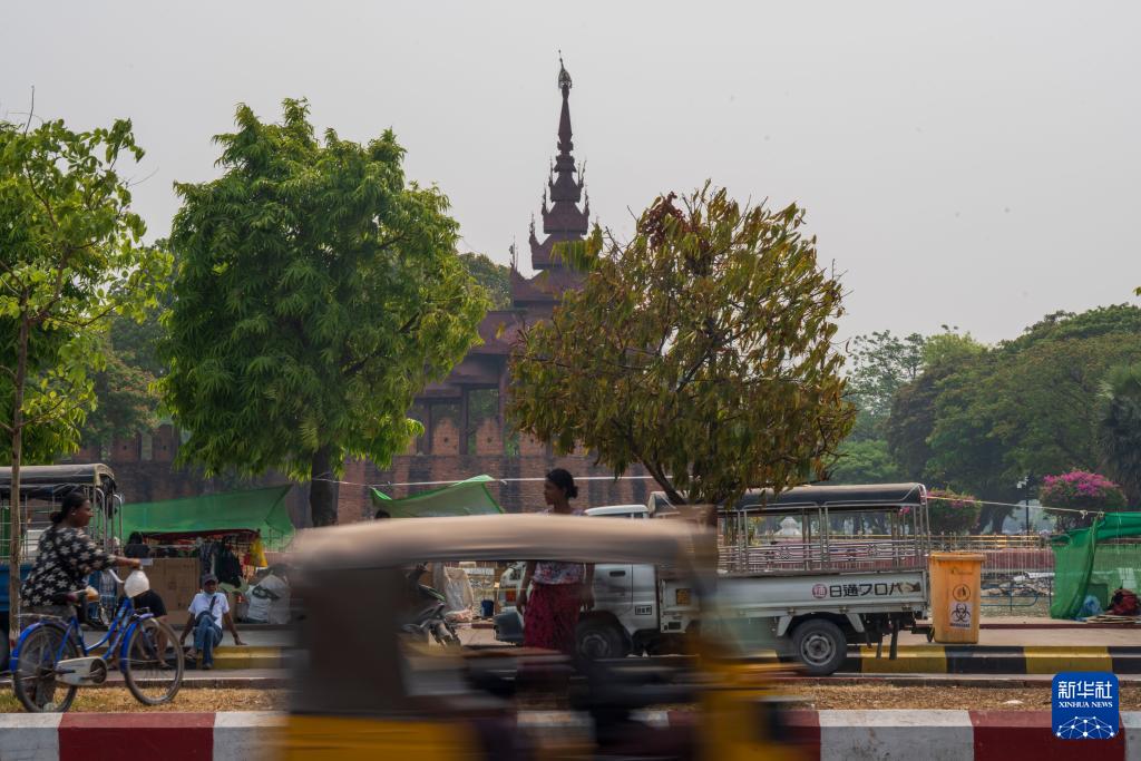 4月4日,在缅甸曼德勒皇宫附近的一处安置点,一名女子穿行马路。新华社记者 才扬 摄