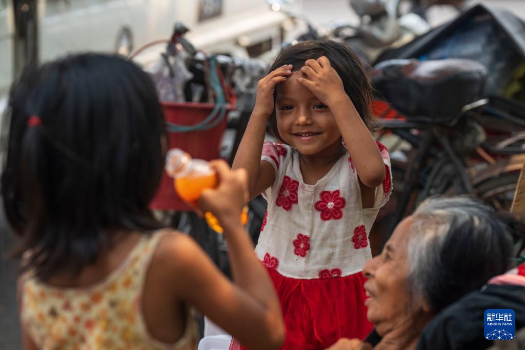 4月4日,在缅甸曼德勒皇宫附近的一处安置点,一名儿童等待领取食物。新华社记者 才扬 摄