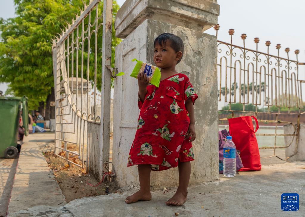 4月4日,在缅甸曼德勒皇宫附近的一处安置点,一名儿童吃着领取的食品。新华社记者 才扬 摄