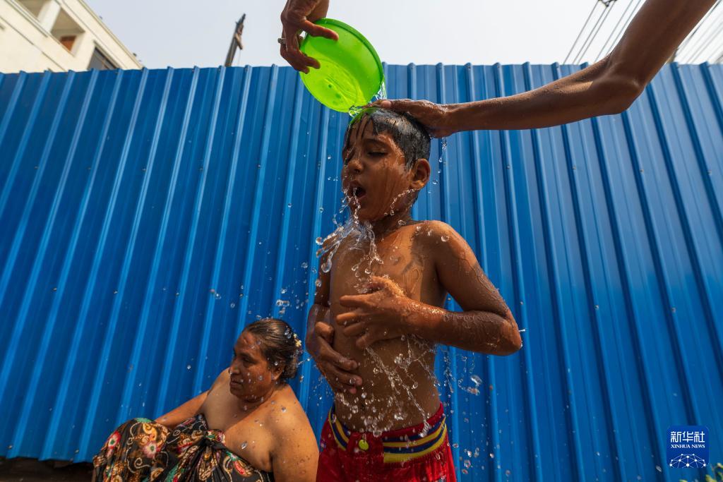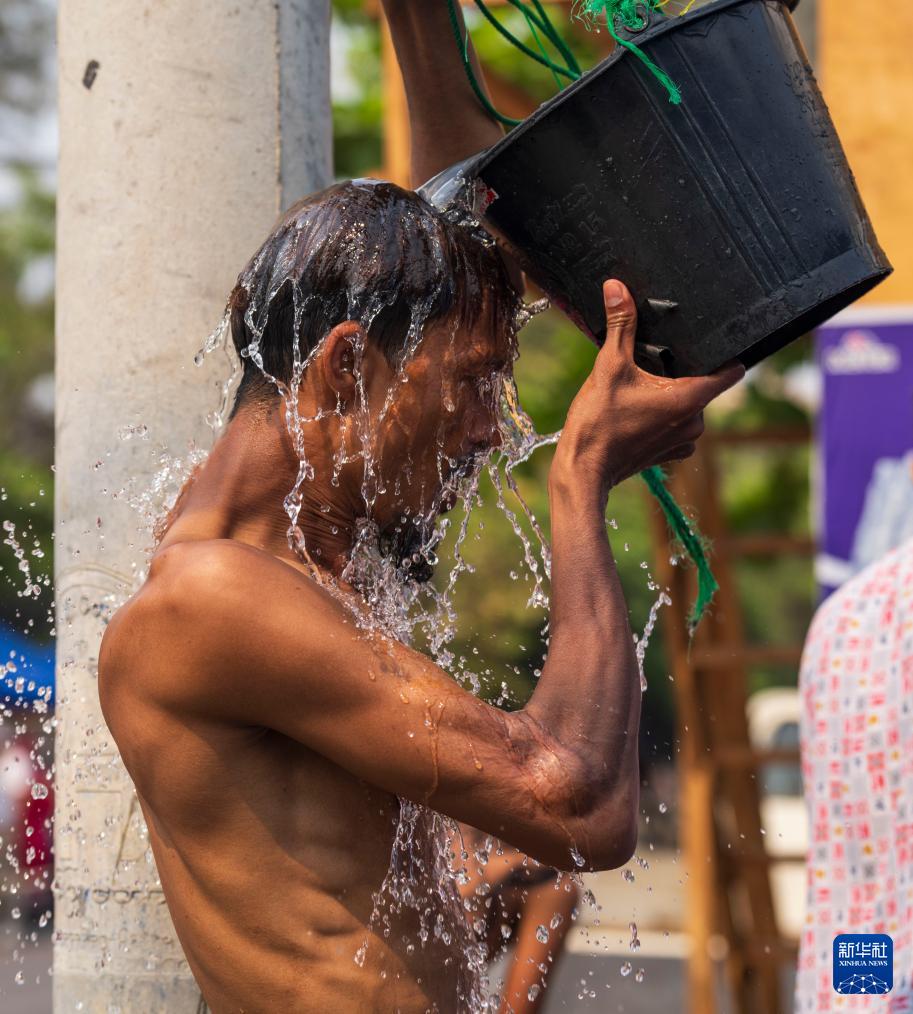 4月4日,在缅甸曼德勒皇宫附近的一处安置点,一名男子冲凉。新华社记者 才扬 摄