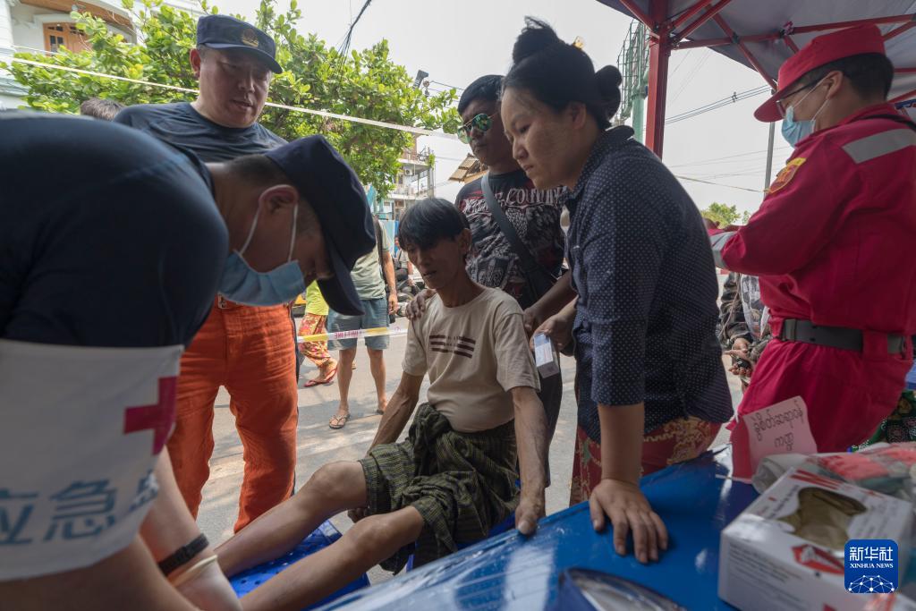 4月4日,在缅甸曼德勒皇宫附近的一处安置点,中国救援队队员为一名男子检查伤情。新华社记者 才扬 摄