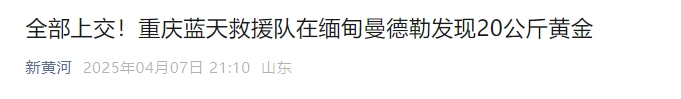 据新黄河综合消息,当地时间4月7日,重庆市蓝天救援队22名队员和云南队等队伍在缅甸曼德勒天空公寓执行地震救援任务时,发现并挖掘出受灾居民黄金约20公斤。