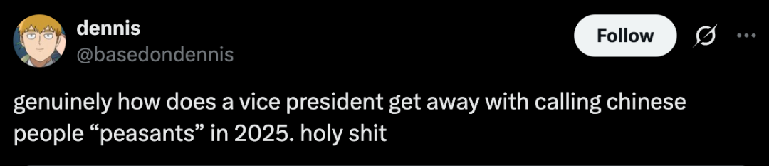 万斯近日接受美国福克斯新闻网采访,在讨论特朗普政府对华贸易政策时其用词引发不满。图源:美国新闻网站BuzzFeed报道援引万斯的话说,“我认为我们所有人都应该退一步并扪心自问,全球化的经济给美国带来了什么?从根本上说,它基于两个原则。背负巨额债务,来购买其他国家为我们制造的东西”。他补充称,“说得更直白一些,就是我们向中国乡巴佬借钱,来购买中国乡巴佬制造的东西”。“如你所料,人们对万斯的言论感到震惊”。BuzzFeed新闻网称。在相关视频评论区,出现许多批评声。“说真的,2025年了,一个副总统怎么还能称中国人为‘乡巴佬’呢”。↓“我的意思是,这么称呼中国人真是太无知了。显然他需要去中国一趟”。↓有人讽刺说,他所谓的“‘中国乡巴佬’正享受着世界上最大的高铁网络、世界上最先进的电动汽车,他们生活在世界上最安全的国家之一,犯罪率很低,他们拥有更实惠、更好的医疗保健、更便宜的食品杂货”。↓还有网友表示,“美国这番言论简直愚不可及。他不清楚中国在文明发展上领先美国数千年吗?全世界早已摒弃这种白人至上情结了”。↓
