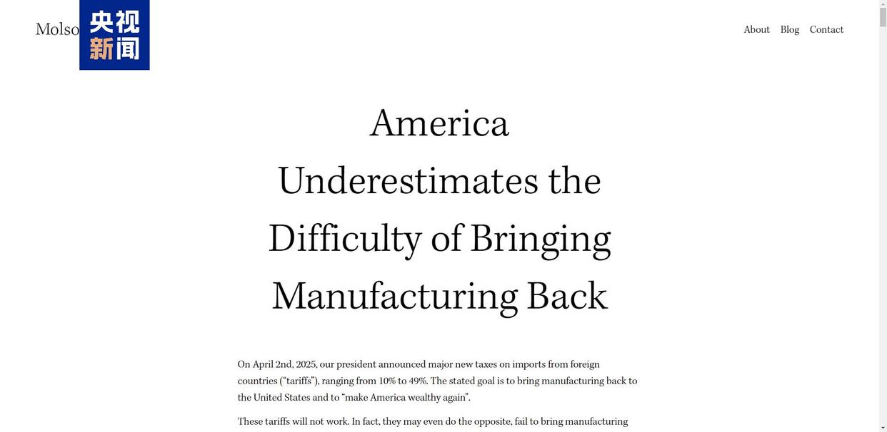 近日,美国一线企业主莫尔森·哈特结合自身经验,发布了题为《美国低估了制造业回流的难度》的文章,“控诉”特朗普的关税政策,并用多个刀刀见血的论点,揭穿了“关税能救‘美国制造’”的致命幻觉。