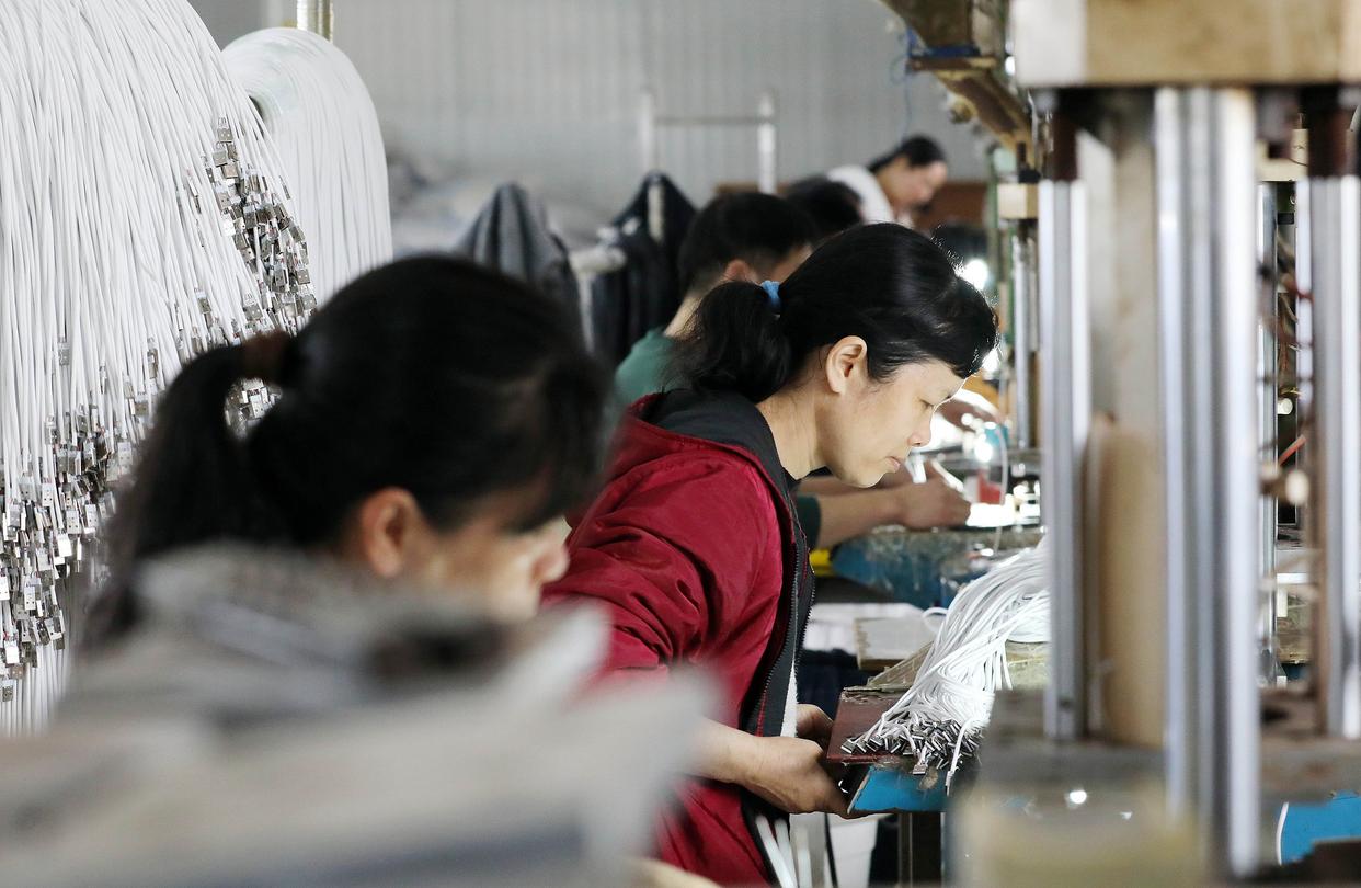 △广西柳州一家电子厂生产车间,工人在生产线上加工数据线等电子产品。