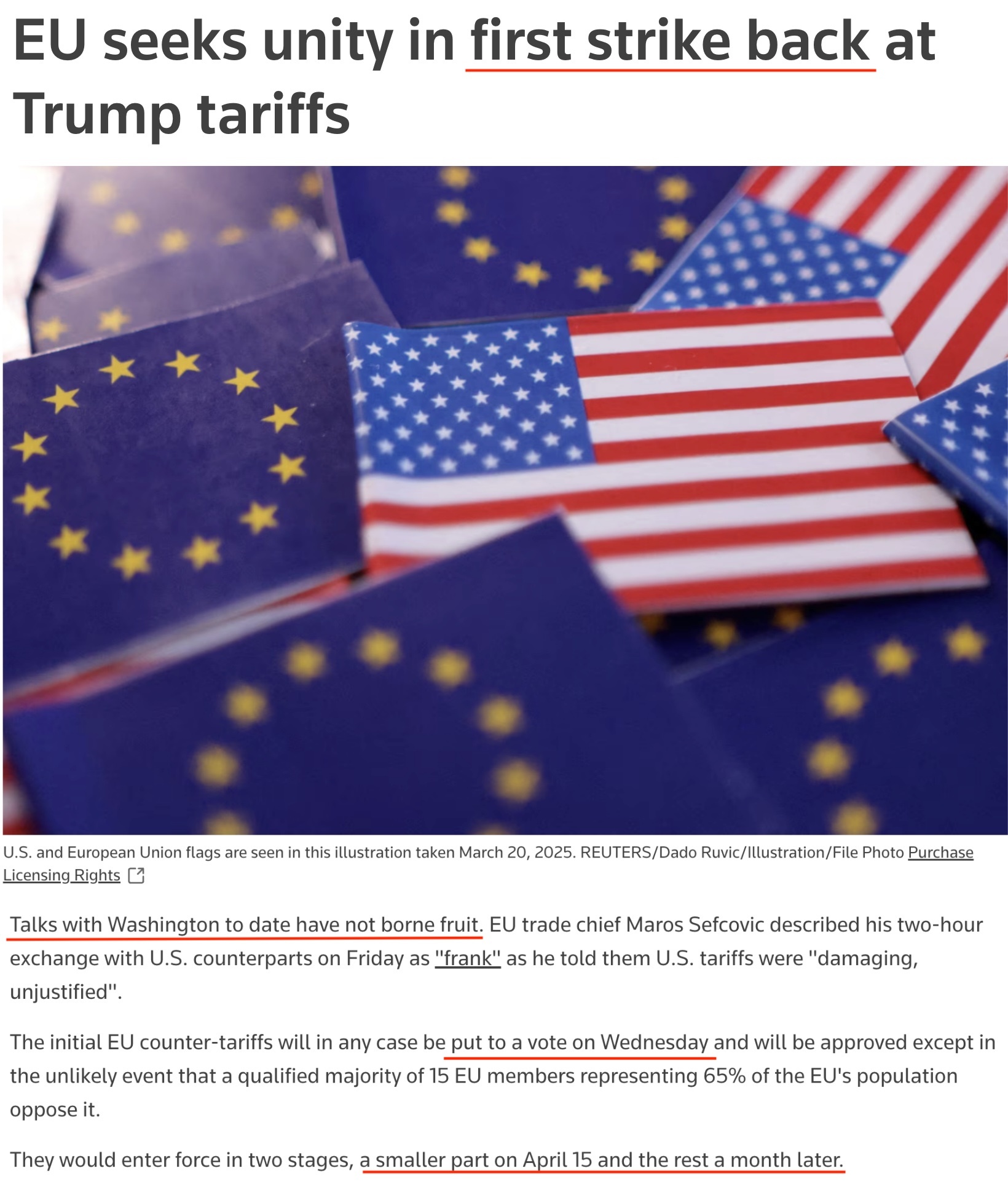 欧盟委员会当天向成员国提议对部分美国产品征收25%关税。相关关税措施将有望先后于4月15日和5月中旬正式生效。