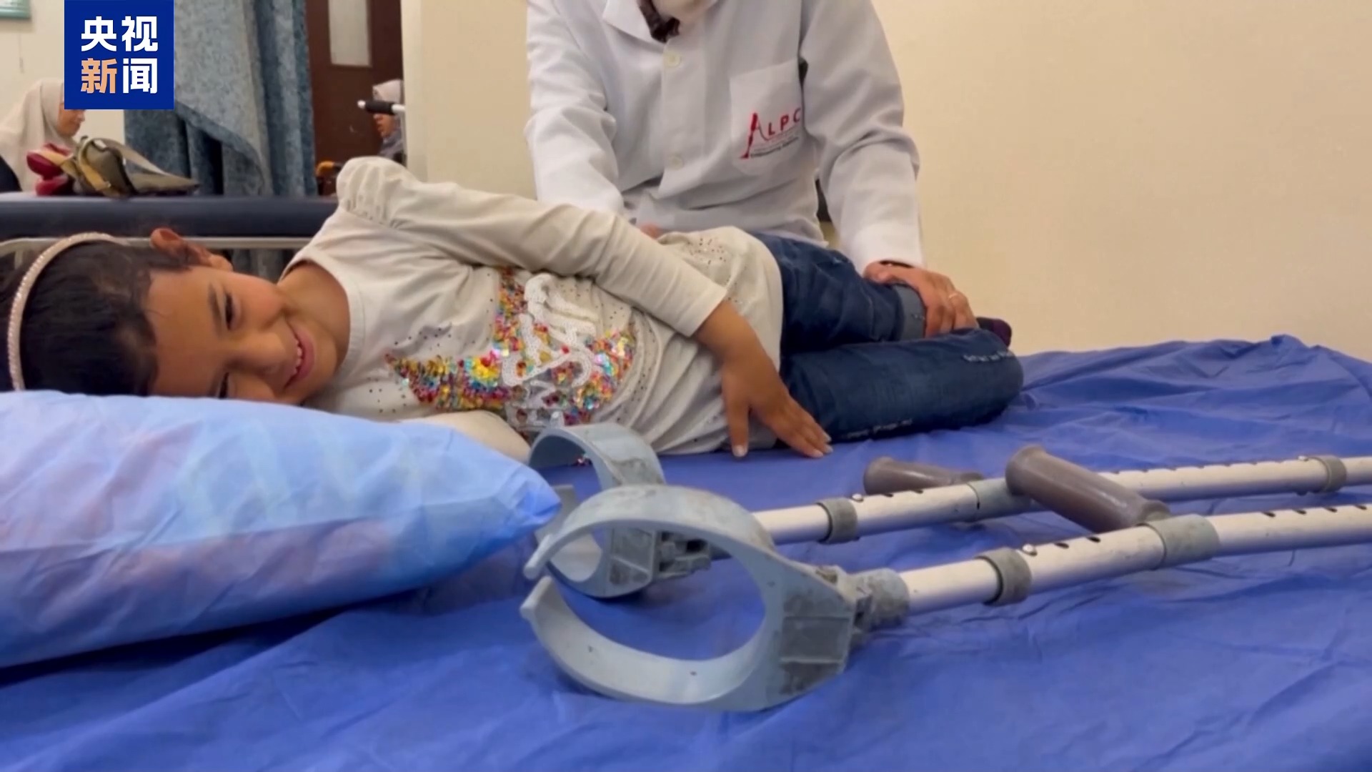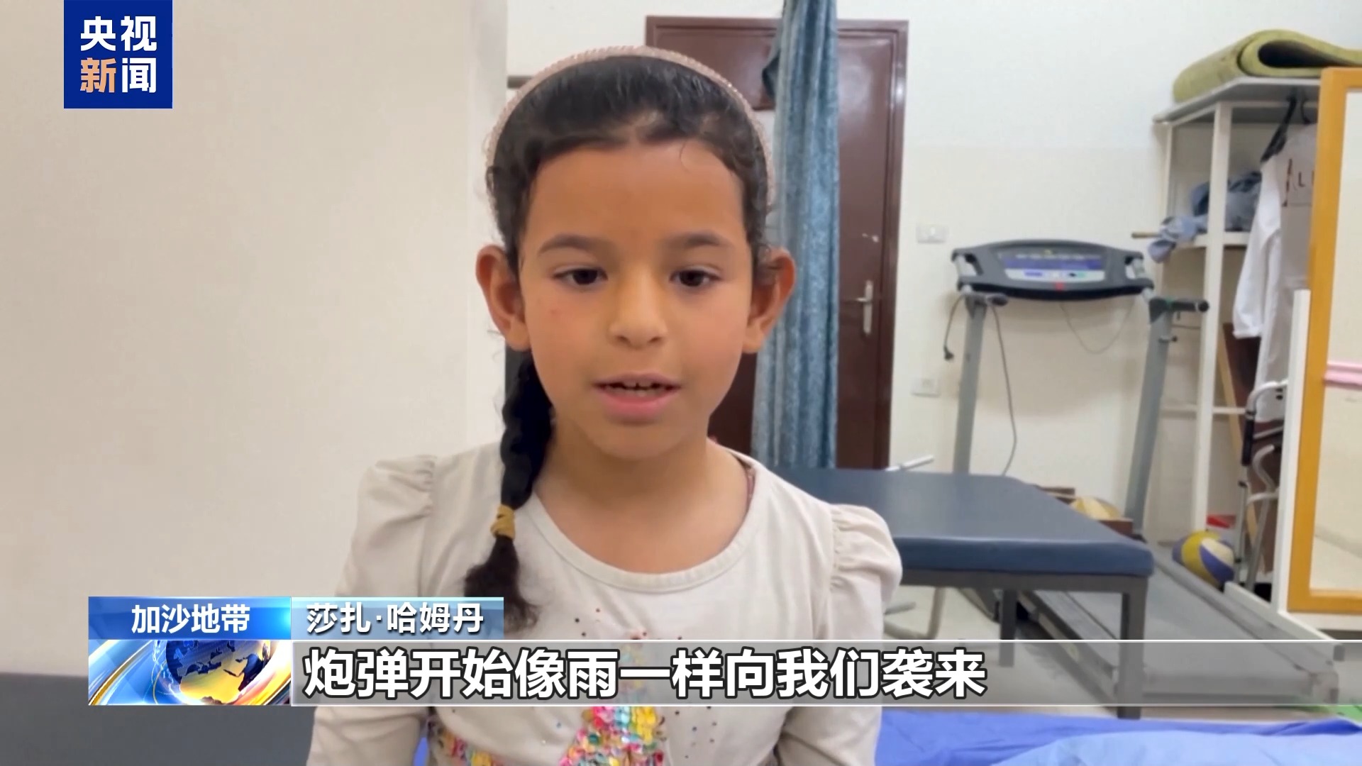 莎扎·哈姆丹:当时我在家里玩儿,爸爸说带我出去散步,我们出去以后,炮弹开始像雨一样向我们袭来,我的腿被炸伤了,爸爸的肩膀也被炸伤了。
