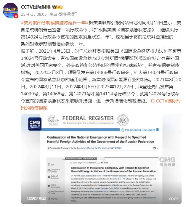 据美国联邦公报网站当地时间4月12日显示,美国总统特朗普已签署一项行政命令,称“根据美国《国家紧急状态法》,继续执行第14024号行政命令宣布的国家紧急状态一年”。这相当于将前总统拜登推出的一系列对俄罗斯制裁措施延长一年。