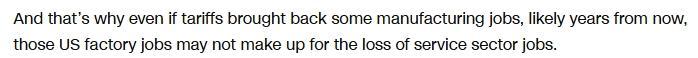 文章认为,即便特朗普的关税政策能够实现一定的制造业回流,其带来制造业工作岗位也无法弥补美国可能因为服贸行业会遭受的反制打击而流失的就业。