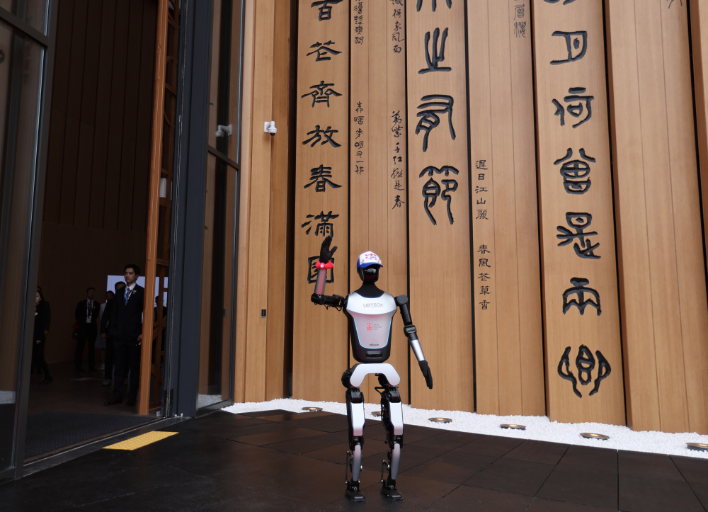 4月13日,在日本大阪,人形机器人在中国馆外向嘉宾招手致意。新华社记者 贾浩成 摄