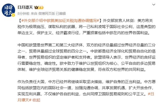 据@日月谭天消息,外交部发言人林剑:美方将关税作为极限施压、谋取私利的武器,将一己私利凌驾于国际社会公利,这是典型的单边主义、保护主义、经济霸凌行径,严重损害包括中欧在内的世界各国利益。