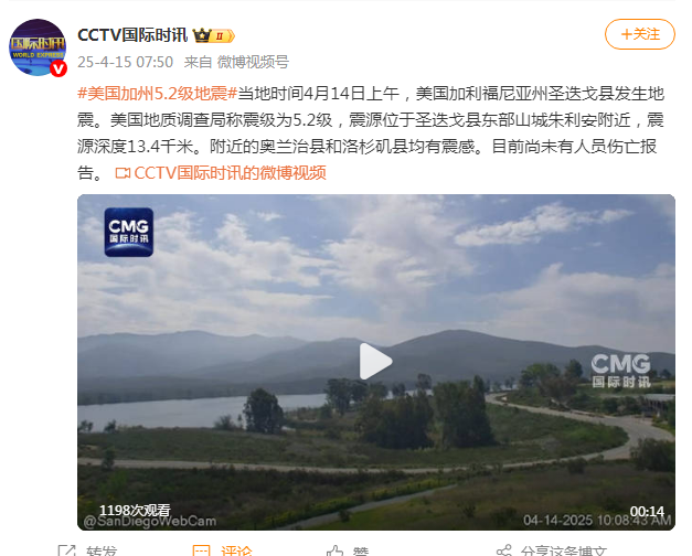 当地时间4月14日上午,美国加利福尼亚州圣迭戈县发生地震。美国地质调查局称震级为5.2级,震源位于圣迭戈县东部山城朱利安附近,震源深度13.4千米。附近的奥兰治县和洛杉矶县均有震感。目前尚未有人员伤亡报告。