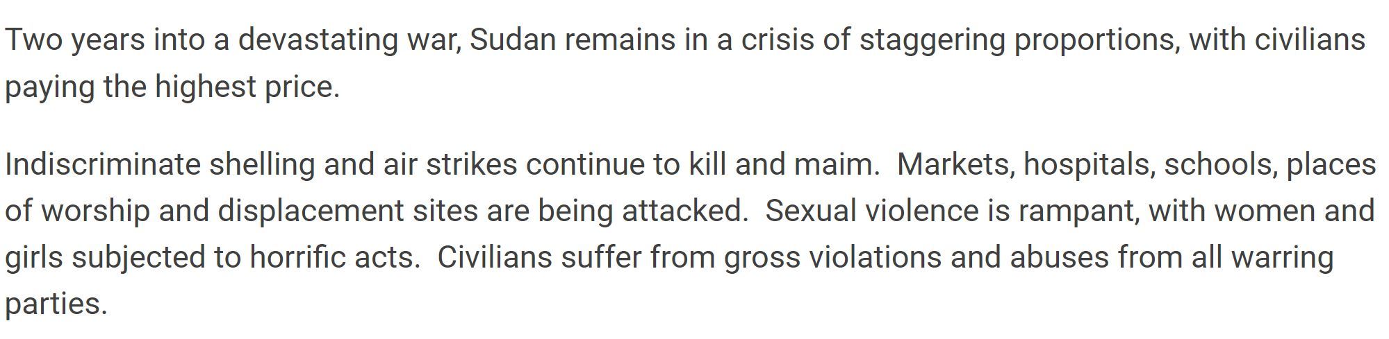 在苏丹武装冲突爆发两周年之际,联合国秘书长古特雷斯14日发表声明说,在这场毁灭性的冲突爆发两年后,苏丹仍深陷规模惊人的人道主义危机,平民继续为此付出最惨重的代价。