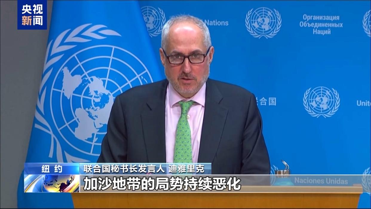 联合国秘书长发言人 迪雅里克:加沙地带的局势持续恶化,联合国发布的人道主义报告称,加沙地带各地的冲突仍在继续,给民用设施和其他关键基础设施造成了毁灭性打击。