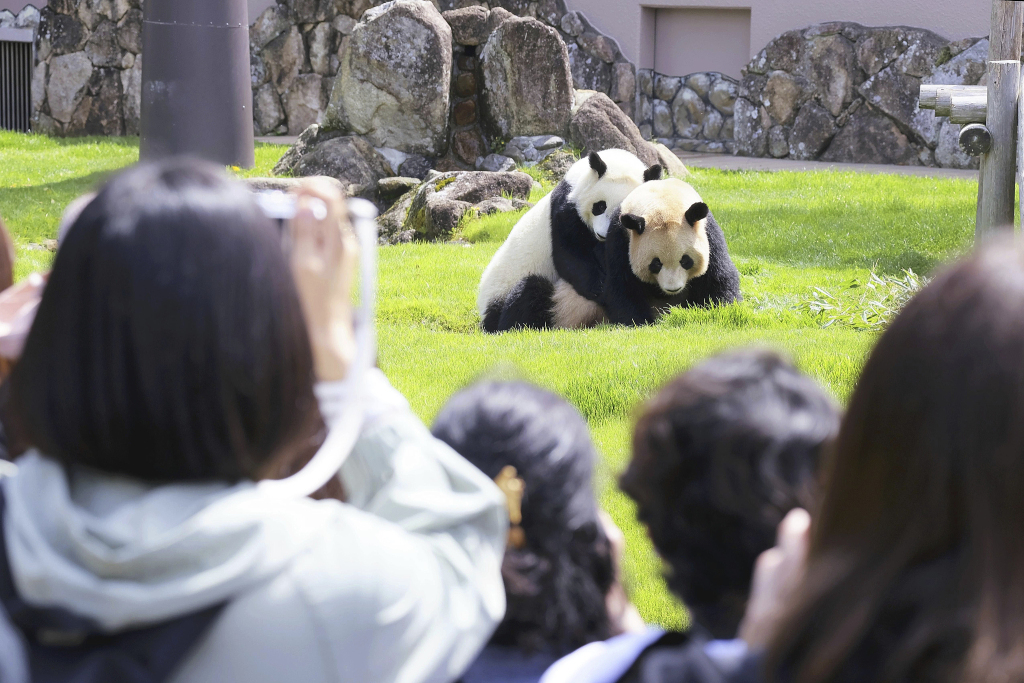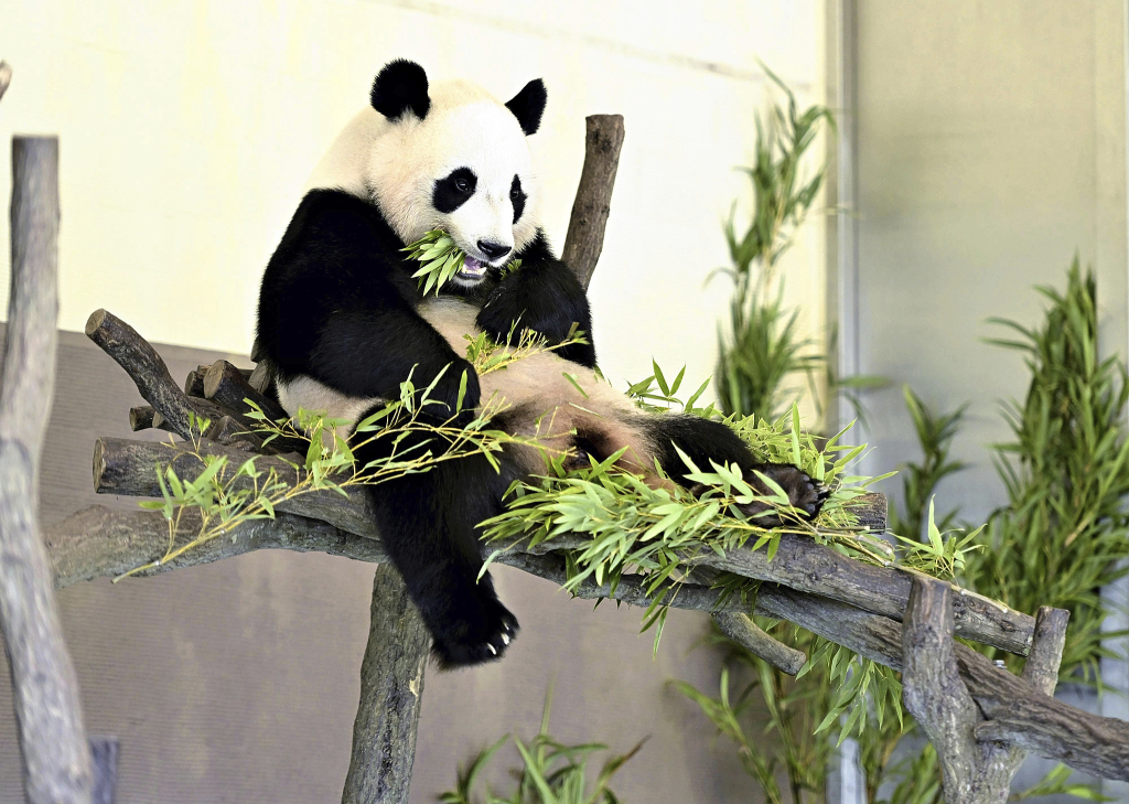 当地时间2025年4月24日,日本和歌山县白浜镇的冒险世界游乐园内,熊猫“结浜”的照片。