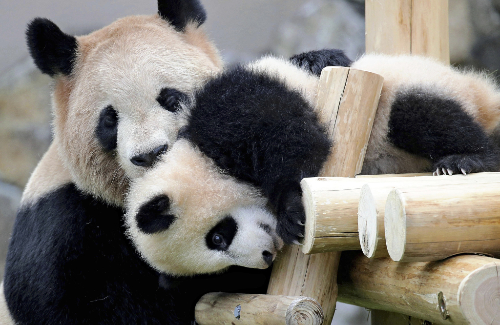 当地时间2022年4月11日,日本和歌山县白滨町的冒险世界游乐园,大熊猫“良浜”(右)与其女儿“枫浜”(左)玩耍。