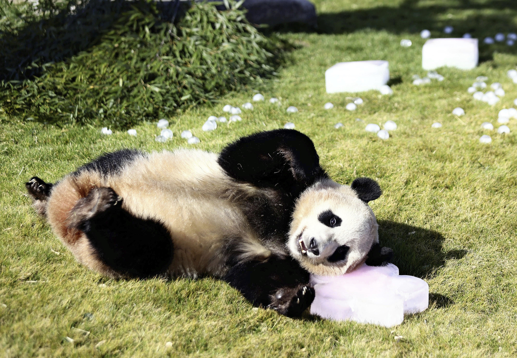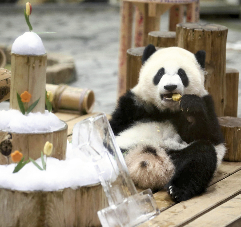 当地时间2023年3月3日,日本和歌山县白浜町冒险世界游乐园,大熊猫“枫浜”在女孩节上收到的礼物:冰块和竹子。
