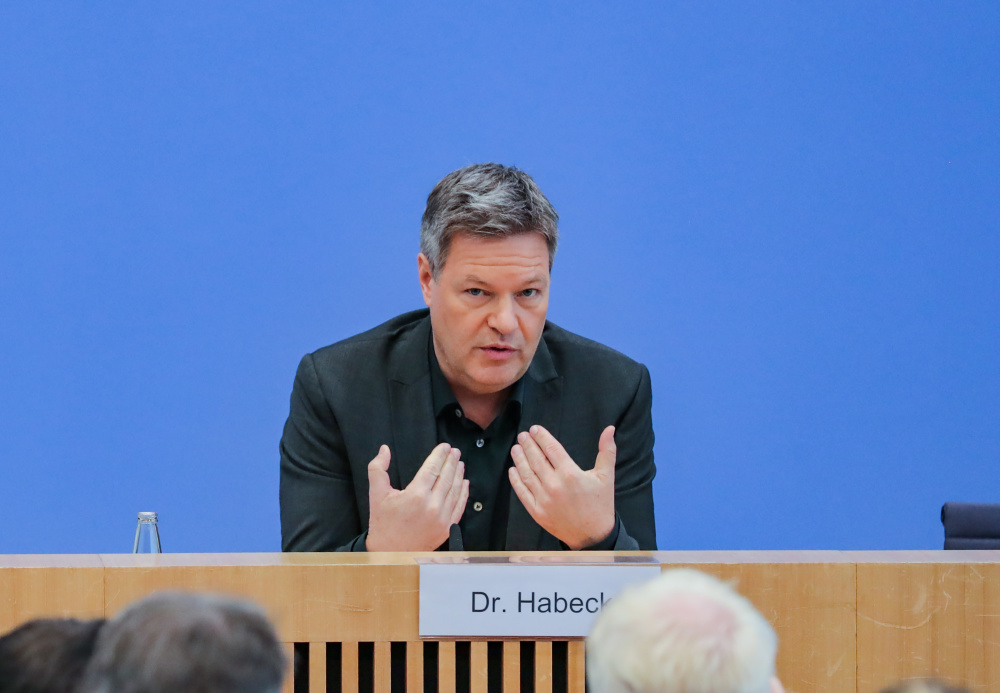 2月24日,在德国柏林,德国副总理兼经济部长哈贝克出席新闻发布会。新华社记者张帆摄
