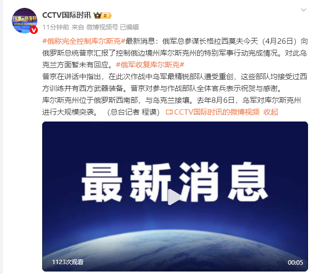 俄军总参谋长格拉西莫夫今天(4月26日)向俄罗斯总统普京汇报了控制库尔斯克州的特别军事行动完成情况。对此乌克兰方面暂未有回应。