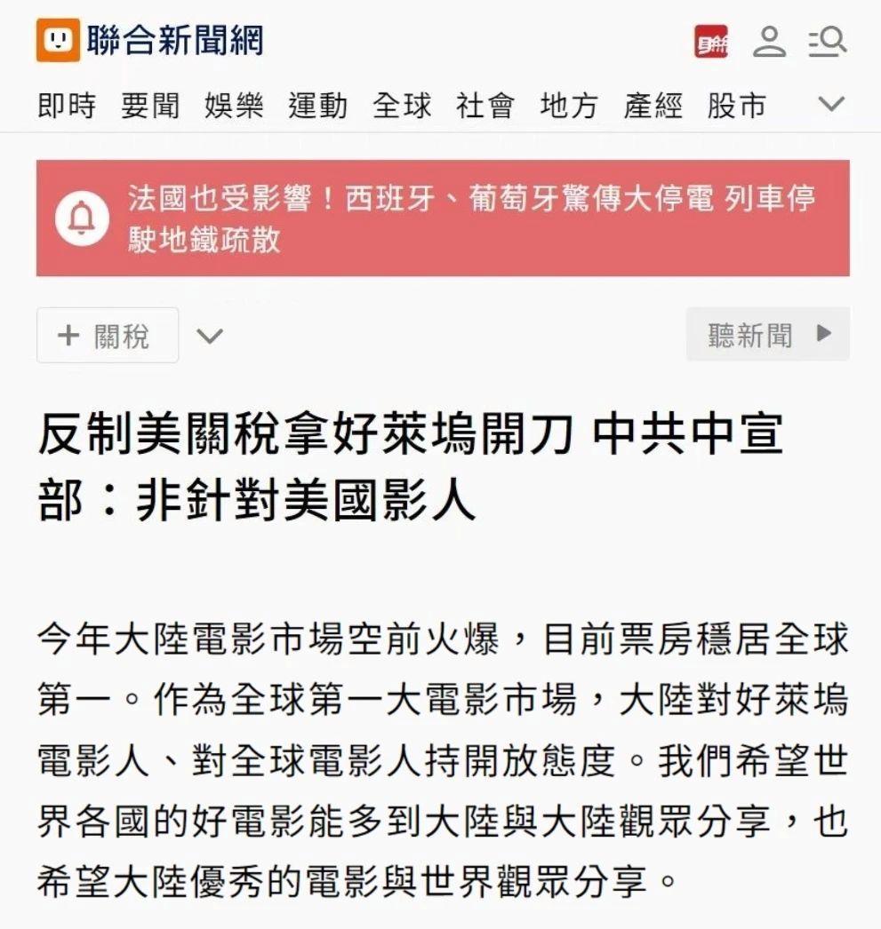 台湾《经济日报》引述报道称,“有的国家自我折腾、折腾全世界,票房只有中国(大陆)的三分之一。”
