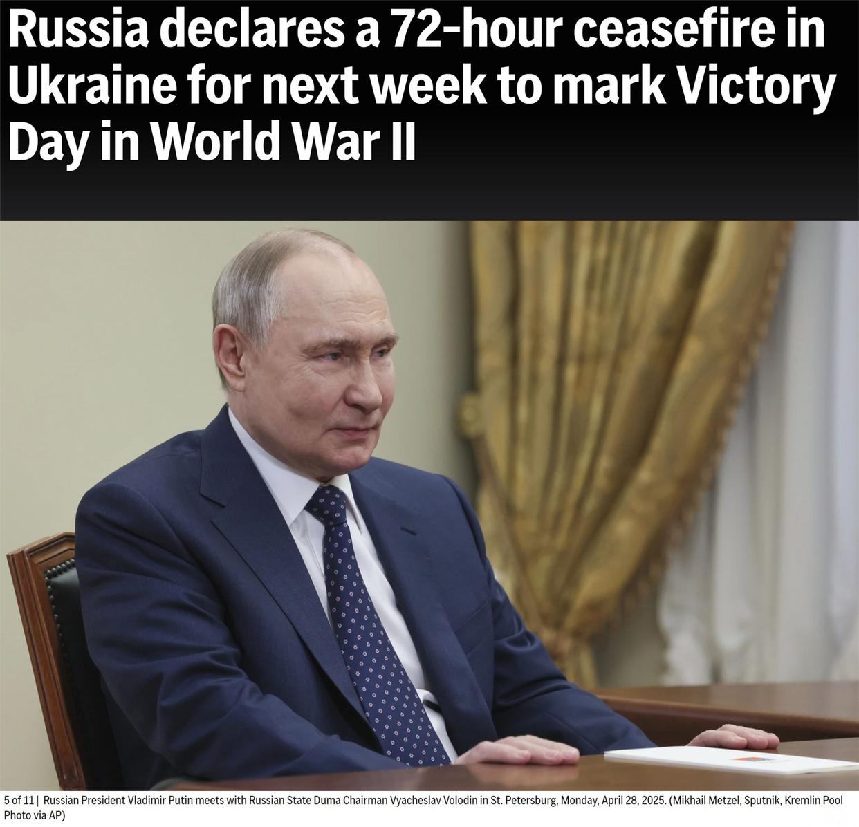 当地时间28日,俄罗斯总统普京宣布,在卫国战争胜利80周年庆典期间,在特别军事行动区域停火72小时,即从当地时间5月8日0时至5月11日0时,暂停一切军事行动。俄方呼吁乌方作出对等安排,如果乌克兰方面违反停火协议,俄军将做出及时且充分的措施回应。