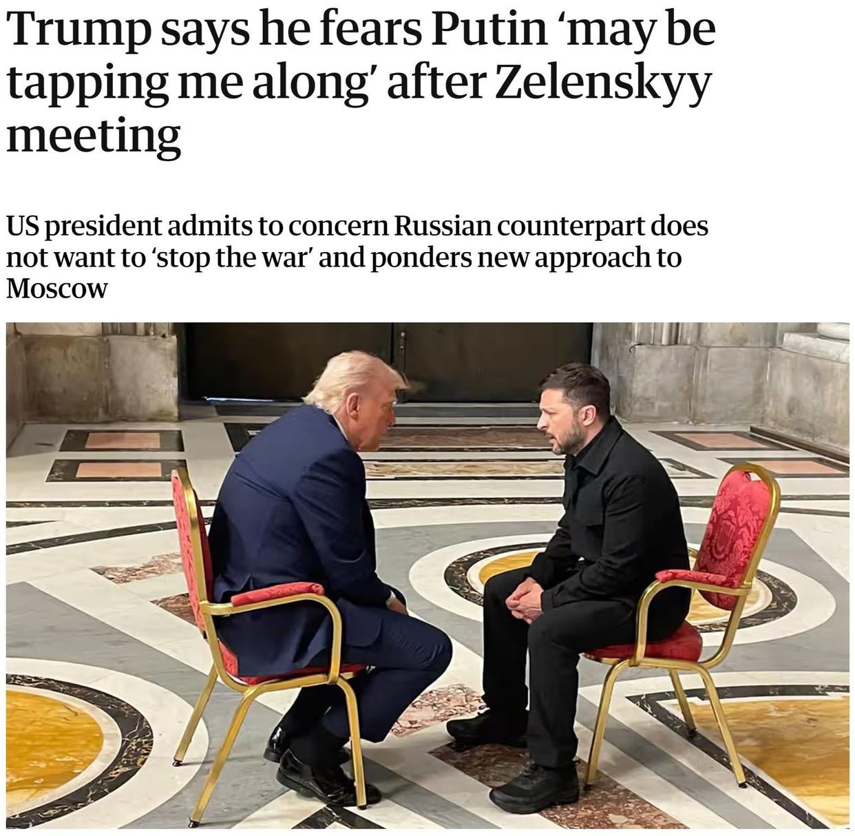 △英国《卫报》报道:美国总统特朗普4月26日在梵蒂冈与乌克兰总统泽连斯基短暂会晤后表示,他质疑普京是否真想“停止战争”,担心普京只是在利用他。