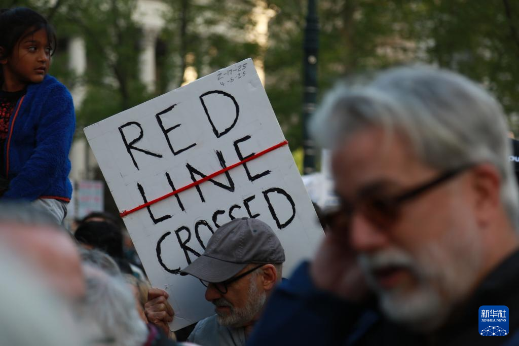 5月1日,人们手持标语在美国纽约参加抗议特朗普政府政策的集会和游行。新华社发(郭克摄)