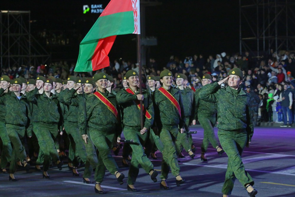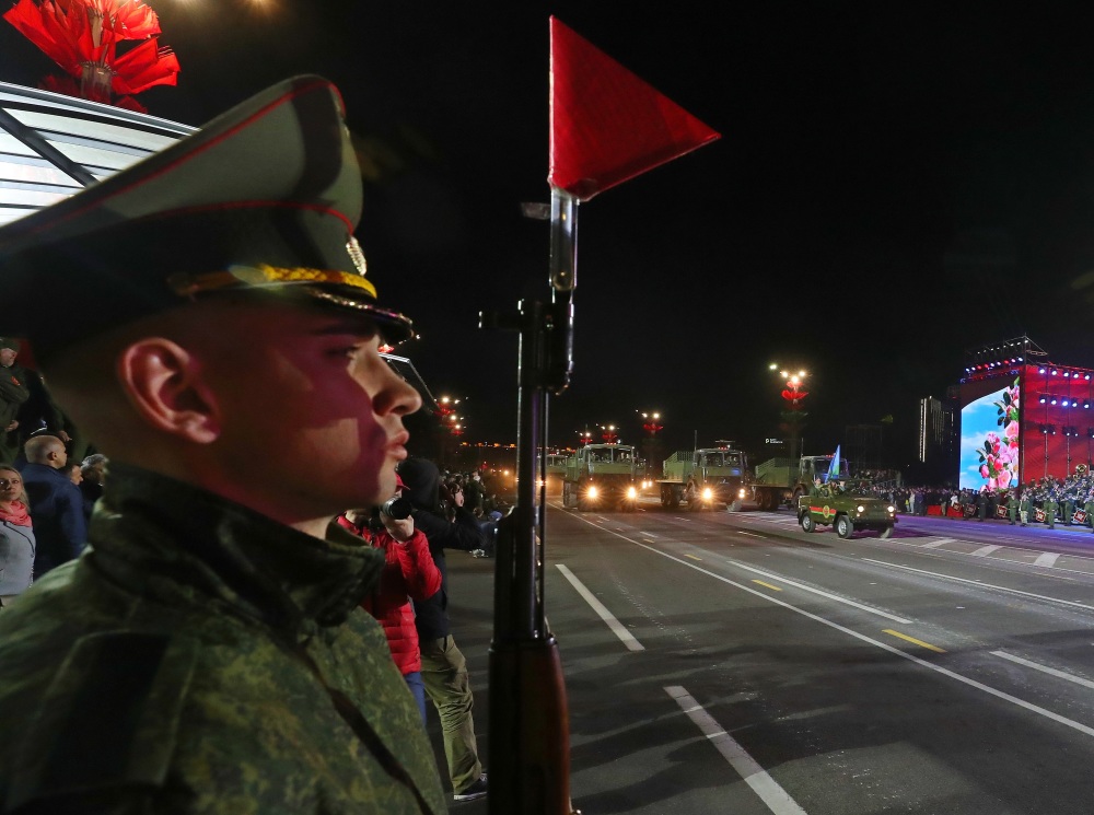 5月2日,在白俄罗斯首都明斯克,表演者参加纪念卫国战争胜利80周年阅兵式彩排。新华社发(任科夫摄)