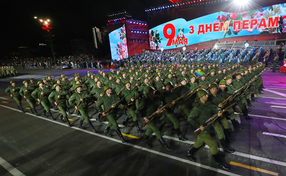 5月2日,在白俄罗斯首都明斯克,士兵列队参加纪念卫国战争胜利80周年阅兵式彩排。新华社发(任科夫摄)