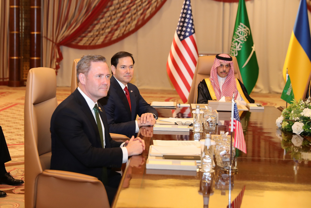 这是3月11日在沙特阿拉伯吉达的会谈现场拍摄的鲁比奥(中)、华尔兹(左)和沙特外交大臣费萨尔。新华社记者王东震摄