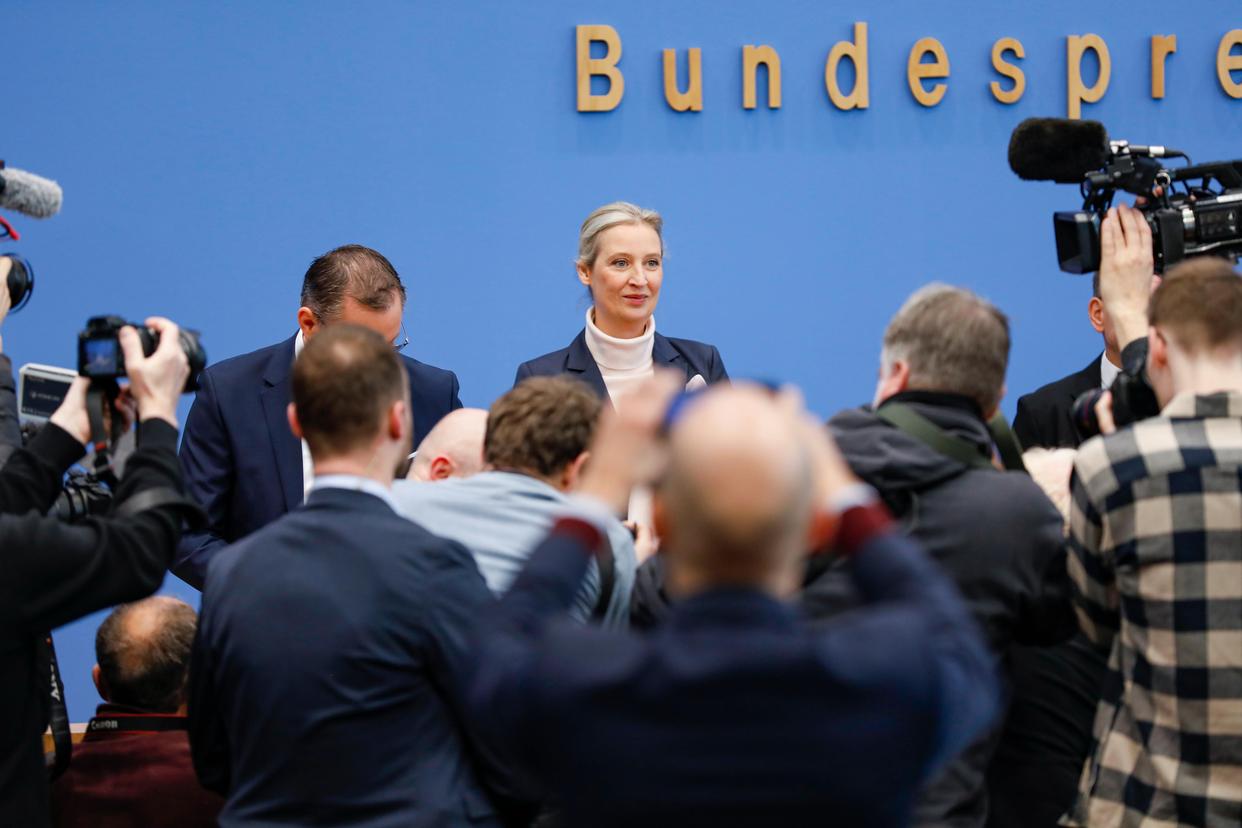 2月24日,在德国柏林,德国选择党领导人魏德尔(中)抵达新闻发布会现场。新华社记者张帆摄