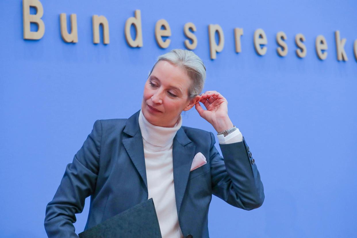 2月24日,在德国柏林,德国选择党领导人魏德尔出席新闻发布会。新华社记者张帆摄