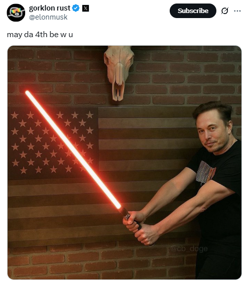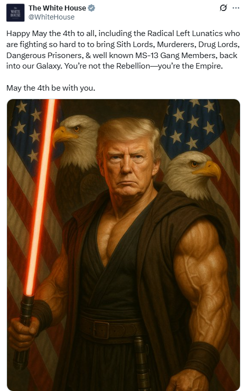 5月4日被《星球大战》影迷们称为“星球大战日”,因为电影中有一句著名台词“May the Force be with you”(愿原力与你同在),其英文发音与“May the 4th be with you(愿5月4日与你同在)”一致。美国白宫和马斯克同日在社交媒体上发图时均配文:“愿5月4日与你同在(愿原力与你同在)。”