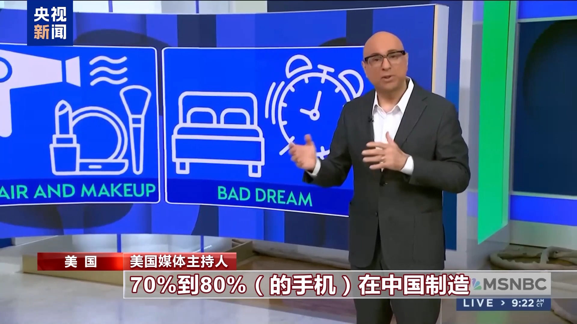 美国媒体主持人:比如,贝蒂想换厨房用品,重新买切菜的刀,82%的菜刀进口自中国。那么用来加热的面包机和微波炉呢?在美国市面上99%的面包机和90%的微波炉全部来自中国,贝蒂用来化妆的化妆刷82%是从中国进口的,吹风机71%进口自中国,提醒你早上起来的闹钟99%也来自中国,她也可能会用智能手机上闹铃,70%到80%(的手机)在中国制造。