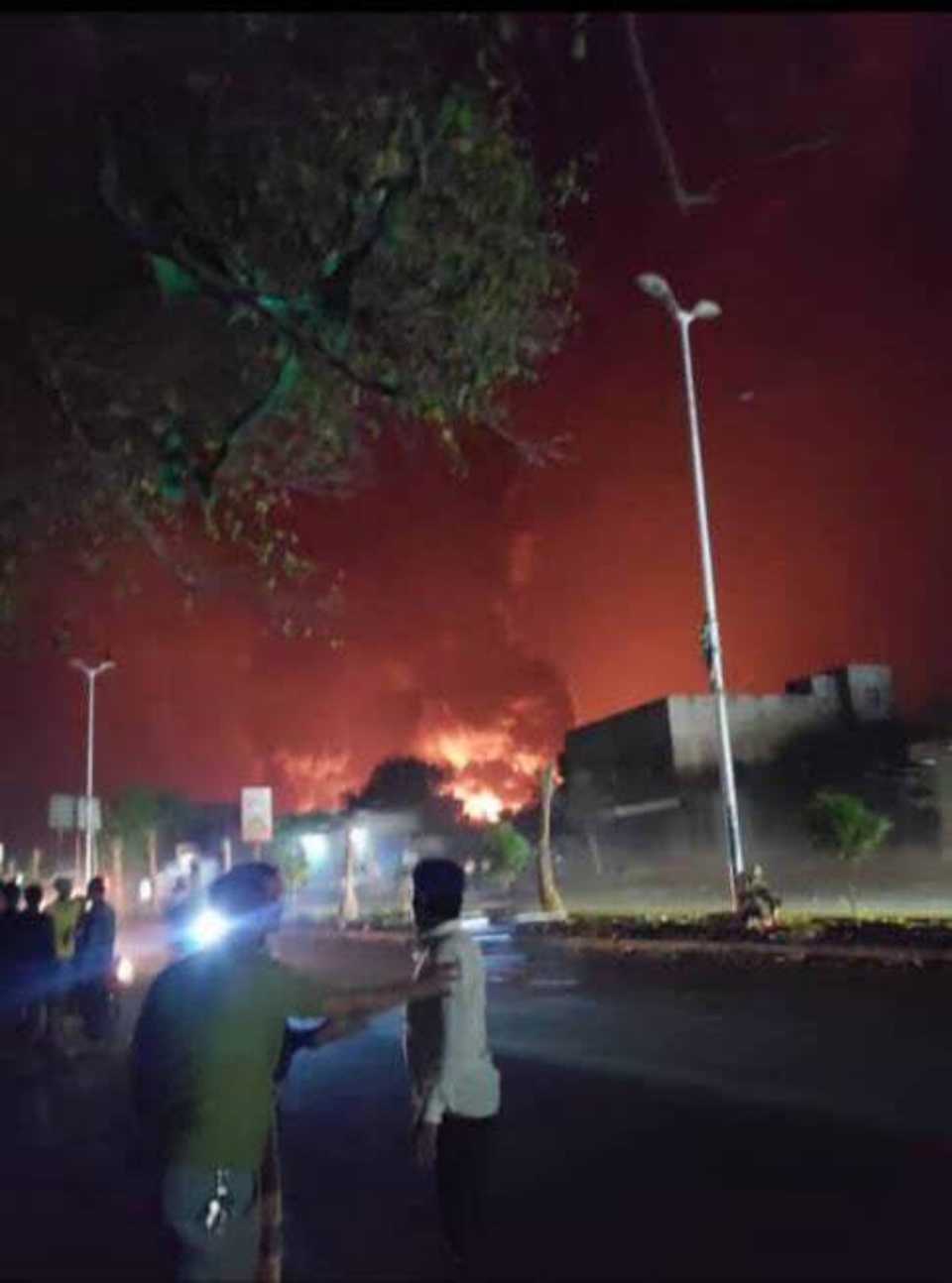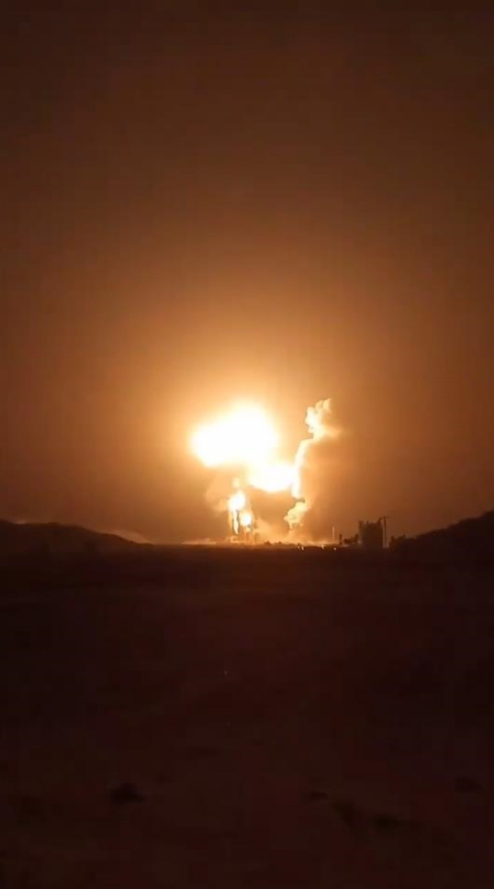 5月5日,在也门荷台达省东部巴吉勒区,一家水泥厂遭到空袭后燃起大火(视频截图)。新华社发