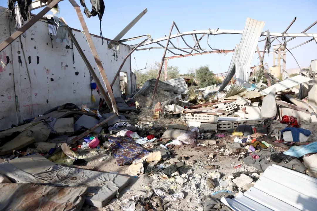 这是4月28日在也门萨达省拍摄的遭到空袭的拘留中心废墟。据也门胡塞武装控制的马西拉电视台4月28日报道,美军当天凌晨空袭了也门北部萨达省一个拘留中心,已造成68人死亡、47人受伤。