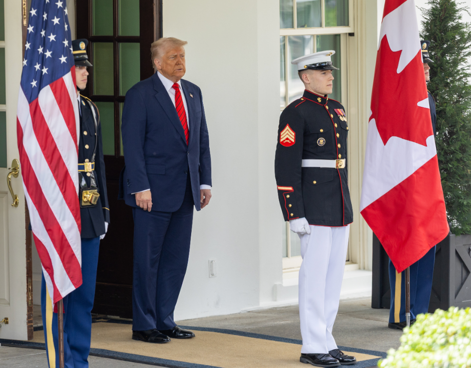 5月6日,美国总统特朗普(左二)在华盛顿白宫迎接到访的加拿大总理卡尼。