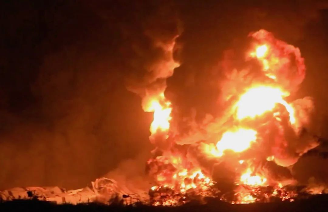 5月5日,在也门荷台达省东部巴吉勒区,一家水泥厂遭到空袭后燃起大火(视频截图)。也门胡塞武装卫生部门5日发表声明说,美国和以色列当天对也门荷台达省发动的空袭已造成至少2人死亡、42人受伤。新华社发(胡塞媒体中心供图)