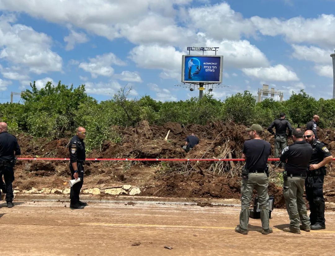 5月4日,在以色列特拉维夫本·古里安国际机场附近,警方在遭导弹袭击的区域工作。